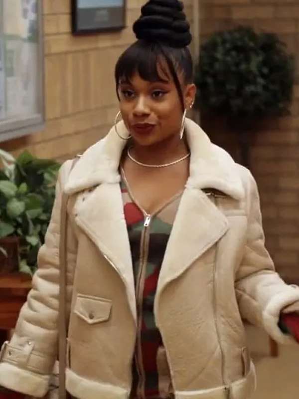 Elevate your style with the Amber Abbott Elementary Shearling Leather Jacket, inspired by Nate’ Jones. This chic jacket is crafted from real leather and lined with soft faux shearling for ultimate comfort and warmth.