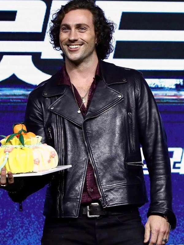 Bullet Train Movie Event Aaron Taylor-Johnson Black Biker Leather Jacket