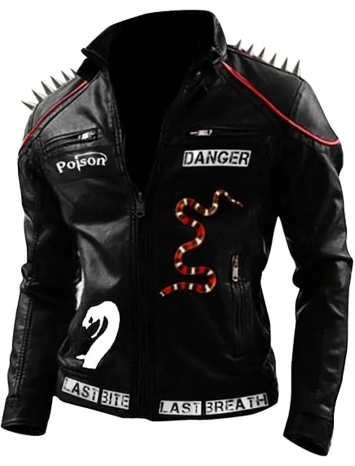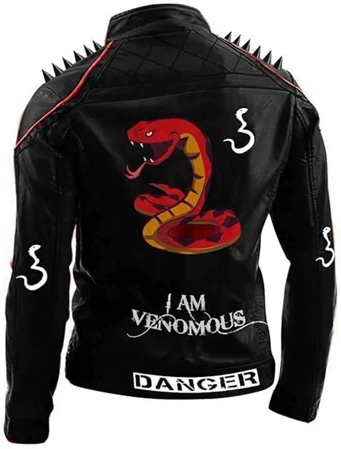 Unleash your bold style with the Adem I Am Venomous Biker Spikes Serpents Leather Jacket. Crafted from real leather, this jacket features striking biker spikes, an erect collar, and a full zipper closure, ideal for adding an edgy flair to any outfit.