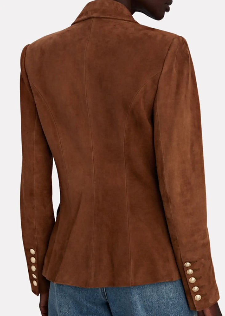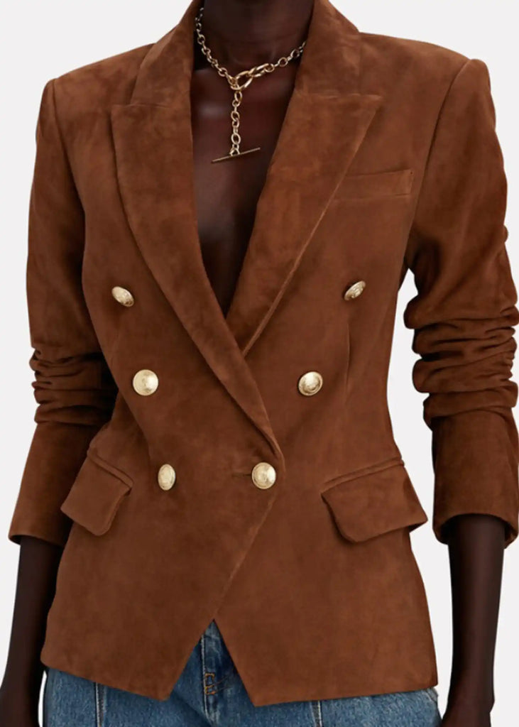 Enhance your wardrobe with the Melinda Monroe blazer from *Virgin River* Season 06, worn by Alexandra Breckenridge. This elegant brown suede leather blazer features a lapel-style collar and a double-breasted button closure. The full-length sleeves with button cuffs, along with multiple pockets, provide both style and practicality. Lined with soft viscose fabric for comfort, this piece is a perfect balance of sophistication and timeless design.