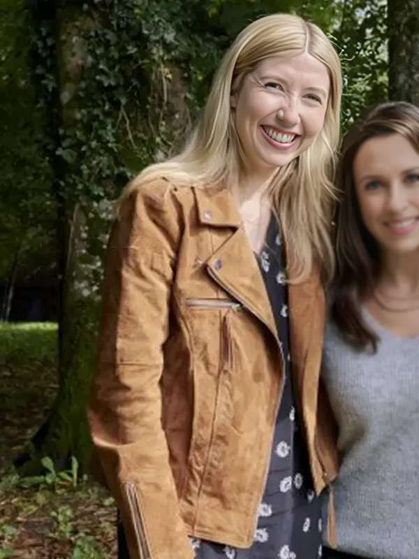This brown suede leather jacket, inspired by Ali Hardiman from *Christmas at Castle Hart*, features a zipper closure, lapel collar, and full-length sleeves for a stylish and warm look.