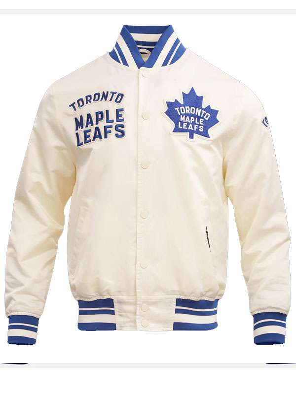 Celebrate your love for hockey with the Toronto Maple Leafs Varsity Bomber Jacket. Crafted from smooth satin fabric and lined with soft viscose, this jacket combines sporty style with everyday comfort. The classic blue and white color scheme proudly reflects team colors, while the ribbed collar, cuffs, and hem give it that authentic varsity appeal. Whether you're at the game or out on the street, this jacket lets everyone know where your loyalty lies. A must-have for every Leafs fan!
