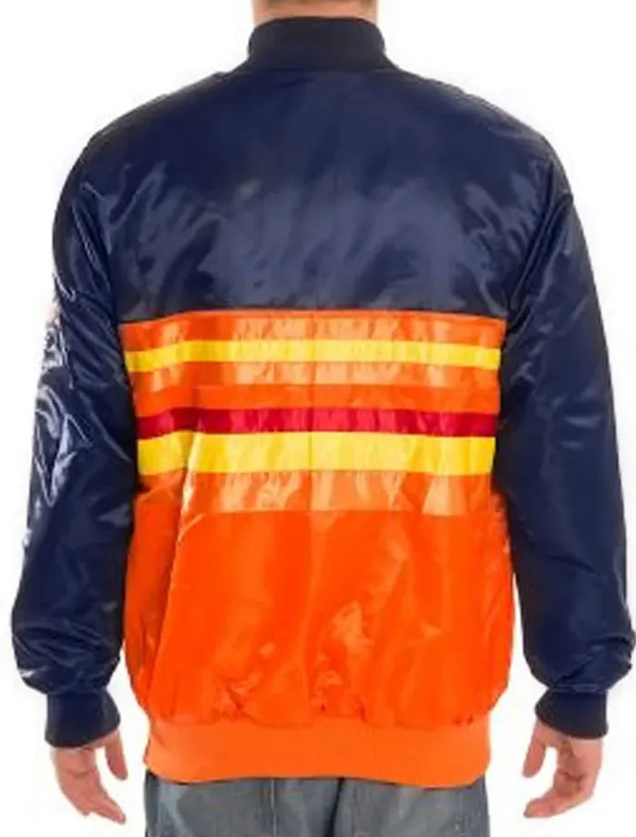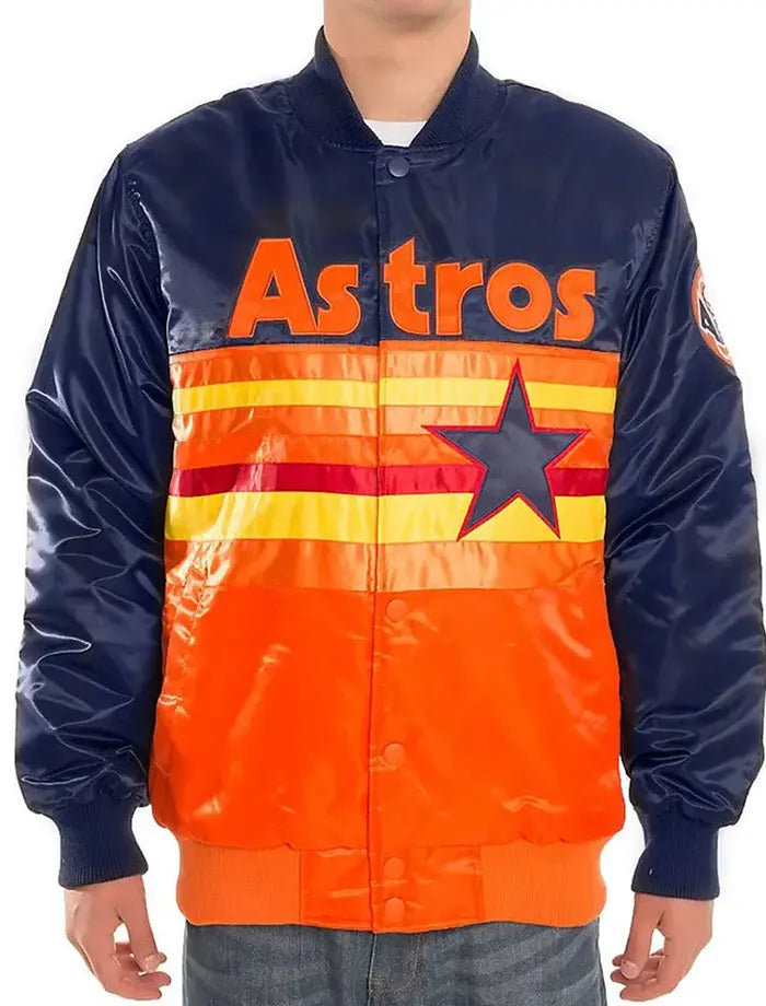 The Torres Houston Astros Satin Varsity Jacket combines comfort and style with a sleek design. Made from satin, it features a ribbed collar, cuffs, and a button closure, perfect for showing off your team spirit.
