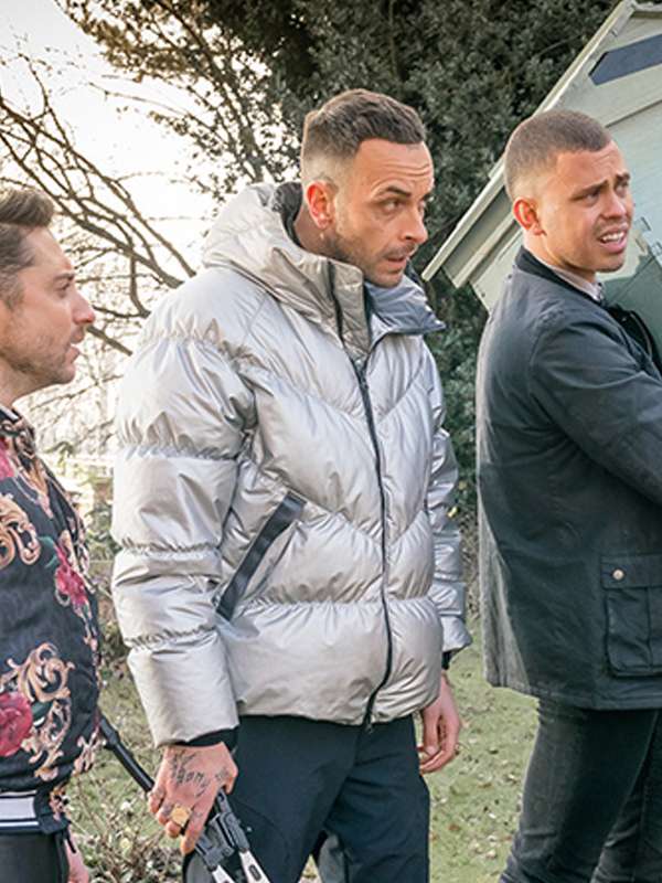 Stay stylish and warm with the silver puffer jacket worn by Joe Gilgun in *Brassic* Season 3.