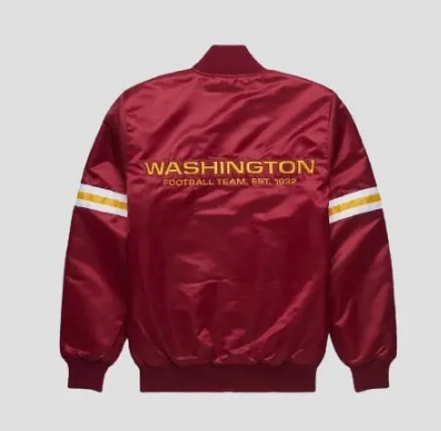 Show your team pride with the "Washington Football Team Satin Jacket." This jacket is the perfect blend of sporty style and fan spirit, designed for dedicated supporters of the Washington Football Team. Crafted with precision, the satin jacket features the team's iconic colors and logo, creating a bold and eye-catching piece that stands out in the crowd. The sleek design and high-quality materials ensure both comfort and durability, making it an ideal choice for game day or casual outings. Whether you're heading to the stadium or cheering from home, the "Washington Football Team Satin Jacket" effortlessly combines team spirit with contemporary style. Embrace the colors of your favorite team and make a statement with this iconic and sporty satin jacket. Make your mark with this distinctive Washington Football Team jacket, celebrating your passion for the game and showcasing your team pride in style.Product Specification: