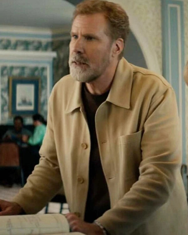 Inspired by Will Ferrell's character Jim in the movie *You're Cordially Invited (2025)*, this beige jacket exudes timeless sophistication. Crafted from high-quality wool fabric, it offers a comfortable fit with its viscose lining, shirt-style collar, and buttoned closure.