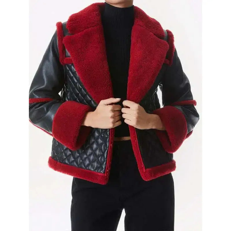 Women’s Pilot Style Aviator B3 Black Leather Red Shearling Jacket