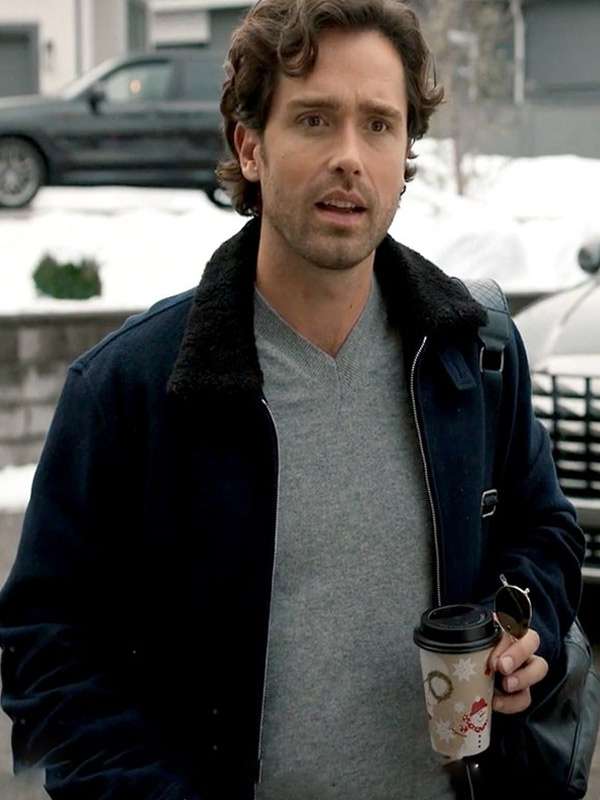 This black shearling jacket, inspired by Alec Santos in *Confessions of a Christmas Letter*, features a stylish shearling collar and cozy fleece fabric. With its full-length sleeves and functional pockets, it's perfect for the festive season.