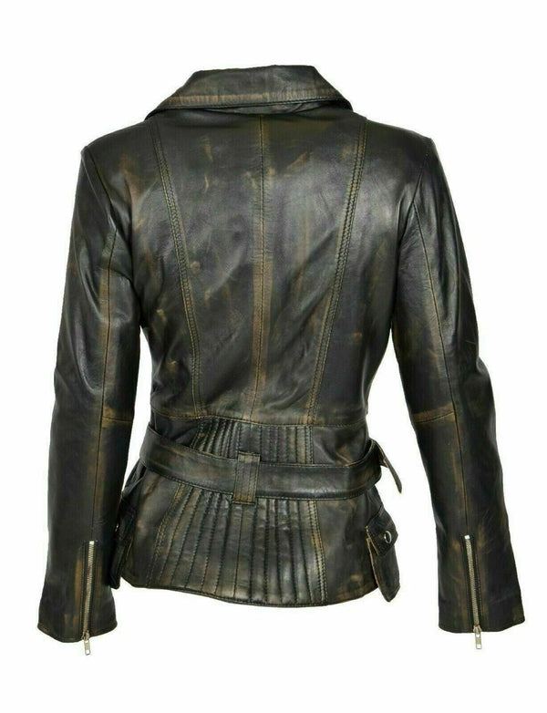 The Brando Distressed Women Biker Jacket in Brown offers a timeless biker look with a collarless design, multiple pockets, and a zip-through front, all crafted from high-quality leather for a stylish and durable outerwear piece.