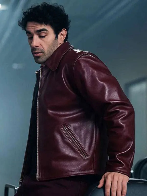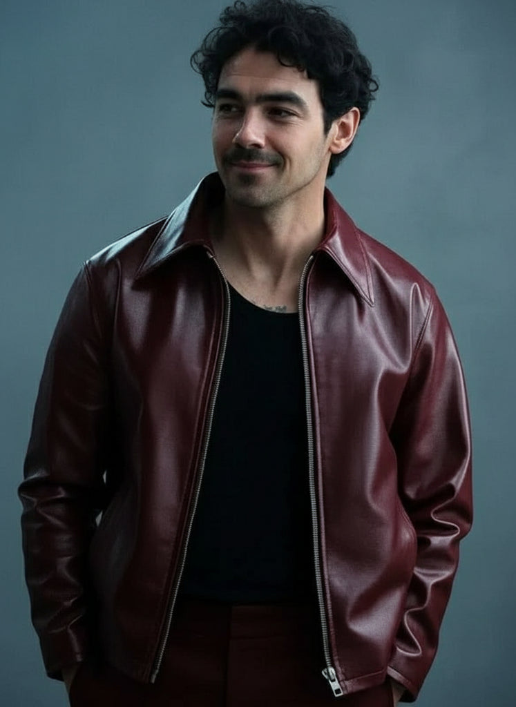 A Very Jonas Christmas Movie 2025 Maroon Leather Jacket