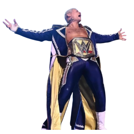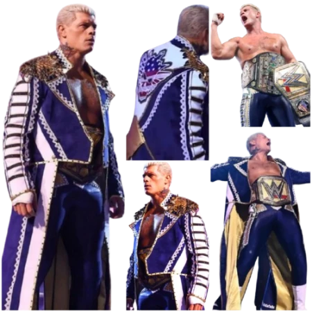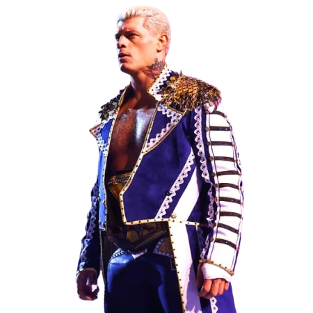 Command attention and channel Cody Rhodes's charisma with the Crown Jewel 2024 Blue Military Coat. Inspired by the unforgettable style worn by the American Nightmare during his iconic performance, this coat is a bold and striking tribute to power and confidence.