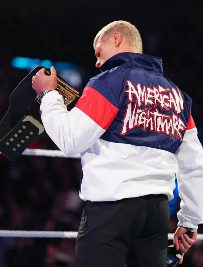 Get the WWE SmackDown Cody Rhodes American Nightmare Jacket, perfect for showing your support for Cody Rhodes in style. Featuring a bold design in white, blue, and red.