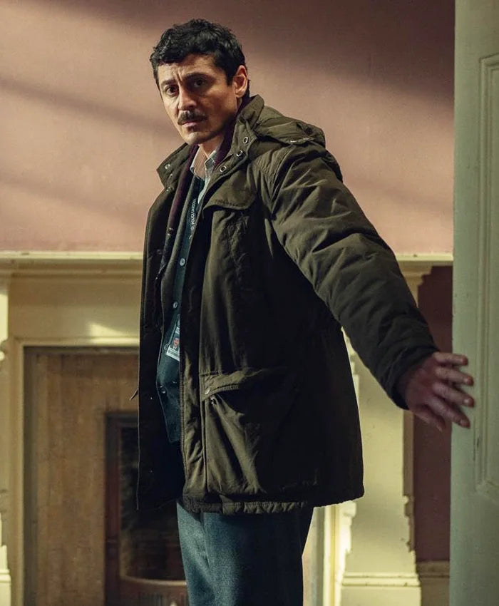Inspired by Alexej Manvelov’s character in *Dept. Q* Season 1, this green hooded jacket offers a casual yet functional style. Made from durable cotton fabric with a soft viscose lining, it ensures comfort and breathability. The jacket features a hooded collar, full-length sleeves, and multiple pockets—four on the outside and two inside—for ample storage. It closes securely with snap tab buttons and a zipper, with open hem cuffs for easy wear.