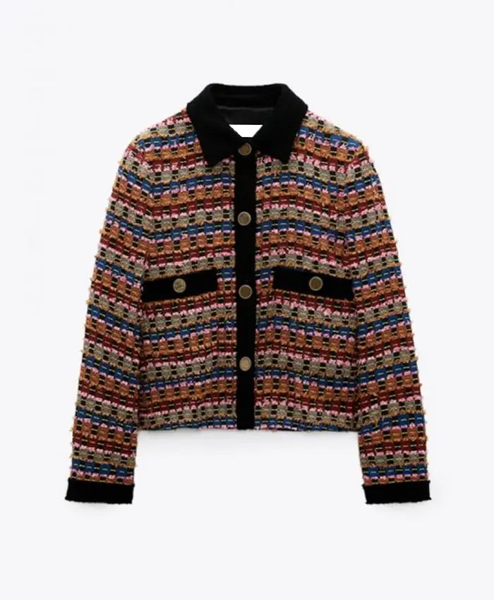 Step into the whimsical and bold style of Mel Bush with this colorful tweed blazer, as seen on Bonnie Langford in Doctor Who Season 13. Made from premium tweed fabric and featuring a soft inner lining, this blazer showcases a drop-down collar, buttoned front closure, and full-length sleeves. Whether you're cosplaying or making a fashion statement, this piece blends vintage flair with timeless tailoring.