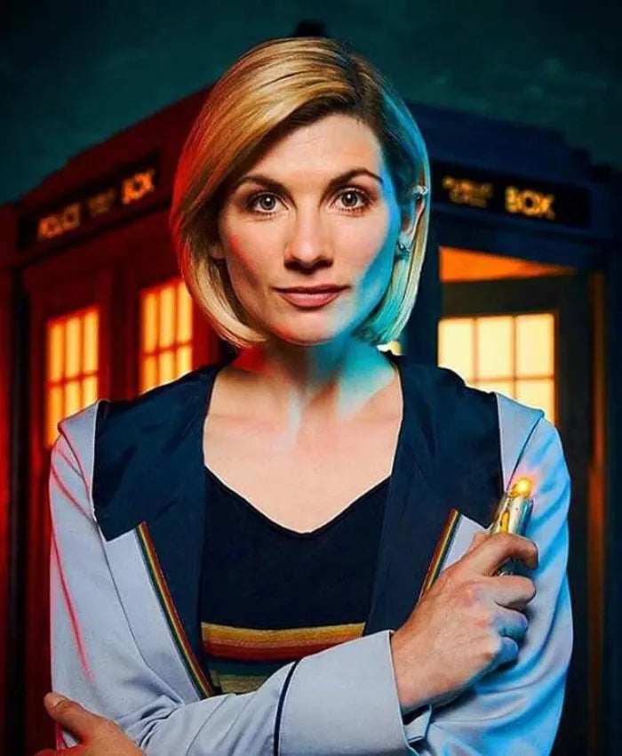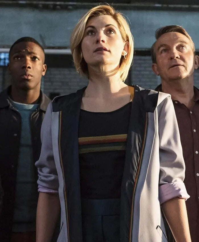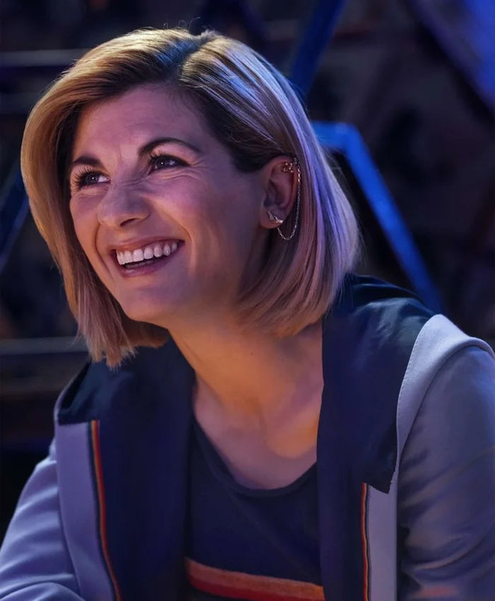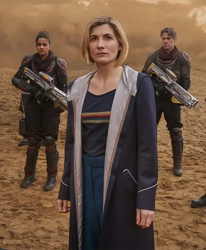 Embrace the iconic style of the Thirteenth Doctor with this Season 13 Grey Long Coat, as worn by Jodie Whittaker in the Doctor Who series. Crafted from premium quality cotton, this reversible coat offers a dual-color design in light gray and blue. It features a soft polyester lining, a relaxed and comfortable fit, and a below-the-knee length for dramatic flair. With practical outer pockets and round cuffs, it's the perfect blend of fashion and function for any fan or outerwear enthusiast.