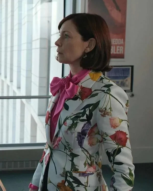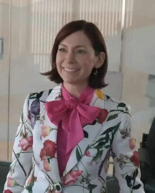 Embrace elegance and grace with the Carrie Preston Elsbeth 2024 White Floral Blazer from the popular TV series. Worn by Carrie Preston as Elsbeth Tascioni, this sophisticated blazer features a beautiful floral design on a clean white backdrop, perfect for formal or semi-casual occasions. Made from high-quality suiting fabric, it offers a lapel style collar, buttoned front closure, and full-length sleeves. The blazer includes two side and two inner pockets, combining classic style with functionality.