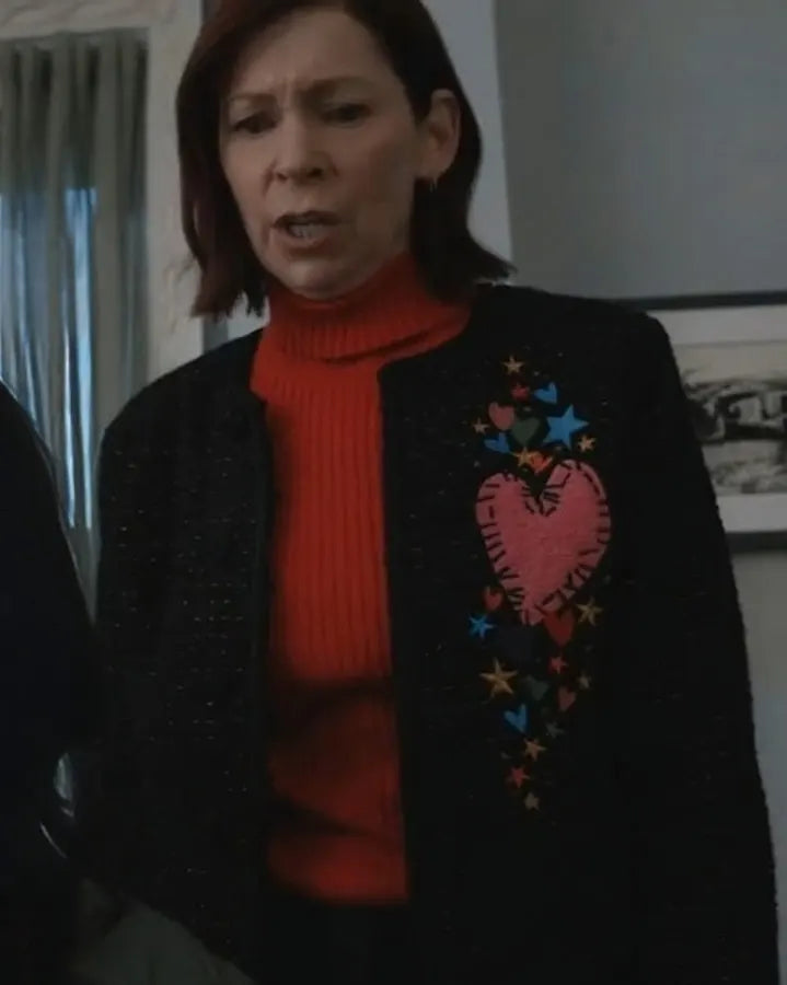 Step into the stylish world of Elsbeth Tascioni with the Elsbeth 2024 Carrie Preston Black Heart Patch Jacket from the 2024 TV series. This unique cropped jacket, worn by Carrie Preston, is made from high-quality tweed fabric, lined with viscose for added comfort. The black jacket features heart patches for a fun, chic look, making it a standout piece in any wardrobe. With its collarless design and YKK zipper front closure, this jacket offers a modern, sleek aesthetic. Full-length sleeves and functional pockets add both style and practicality to this trendy outerwear.