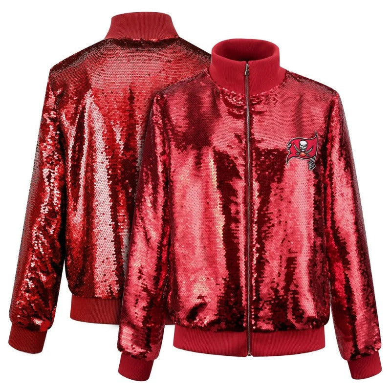 Show off your team pride with the TB Buccaneers Sequins Jacket, a striking blend of sports enthusiasm and dazzling fashion. This jacket features vibrant sequins in the Tampa Bay Buccaneers' signature colors, creating a bold, eye-catching effect. Designed with a classic bomber silhouette, it includes ribbed cuffs, collar, and hem for a comfortable and stylish fit. The front zip closure offers ease of wear, while the soft inner lining ensures comfort throughout the day or night. Whether you're cheering at the game, attending a tailgate party, or just showing off your team spirit, the TB Buccaneers Sequins Jacket is perfect for pairing with jeans, skirts, or casual attire. Shine bright and support your team with this standout piece.