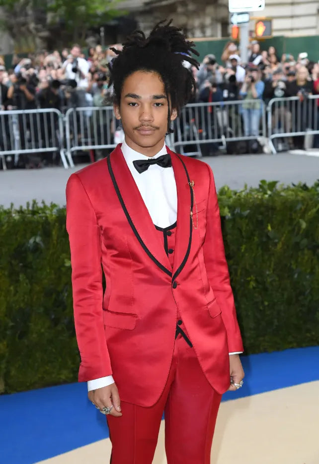Step into sophistication with the Luka Grown-ish Red Tuxedo Suit, a statement piece inspired by the character's distinguished style. Perfect for formal occasions or red-carpet events, this suit exudes elegance and confidence. Crafted from high-quality fabric, it features a classic tailored fit that enhances the silhouette, offering both comfort and impeccable style. The bold red color adds a modern twist to the traditional tuxedo design, making it a standout choice. The suit jacket is detailed with satin peak lapels, a single-button closure, and welt pockets, while the matching pants feature a flat front and satin side stripes for a polished finish. Elevate your formal wardrobe with the Luka Grown-ish Red Tuxedo Suit. Available in various sizes, it ensures a personalized fit for every wearer. Make a lasting impression with this tuxedo suit that embodies sophistication and contemporary flair, perfect for those who appreciate timeless style with a modern edge.