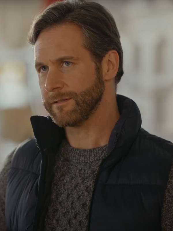 Inspired by Matt Wells as Andrew Flannery in *Christmas on the Alpaca Farm* 2024, this blue puffer vest offers both comfort and style.