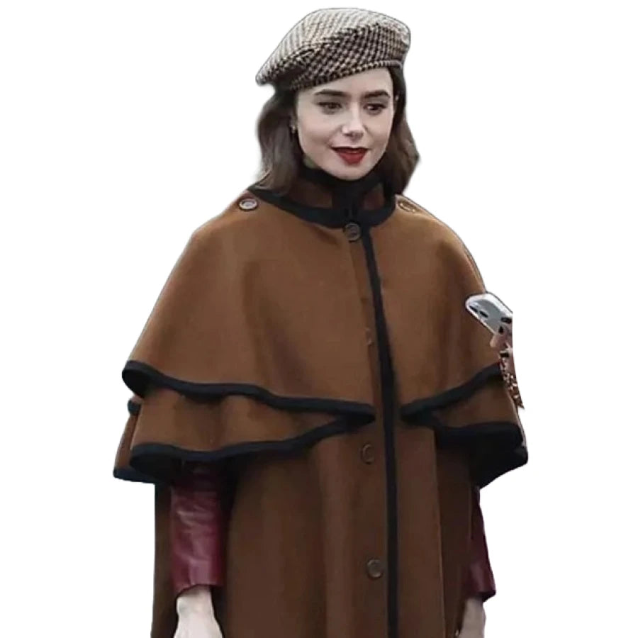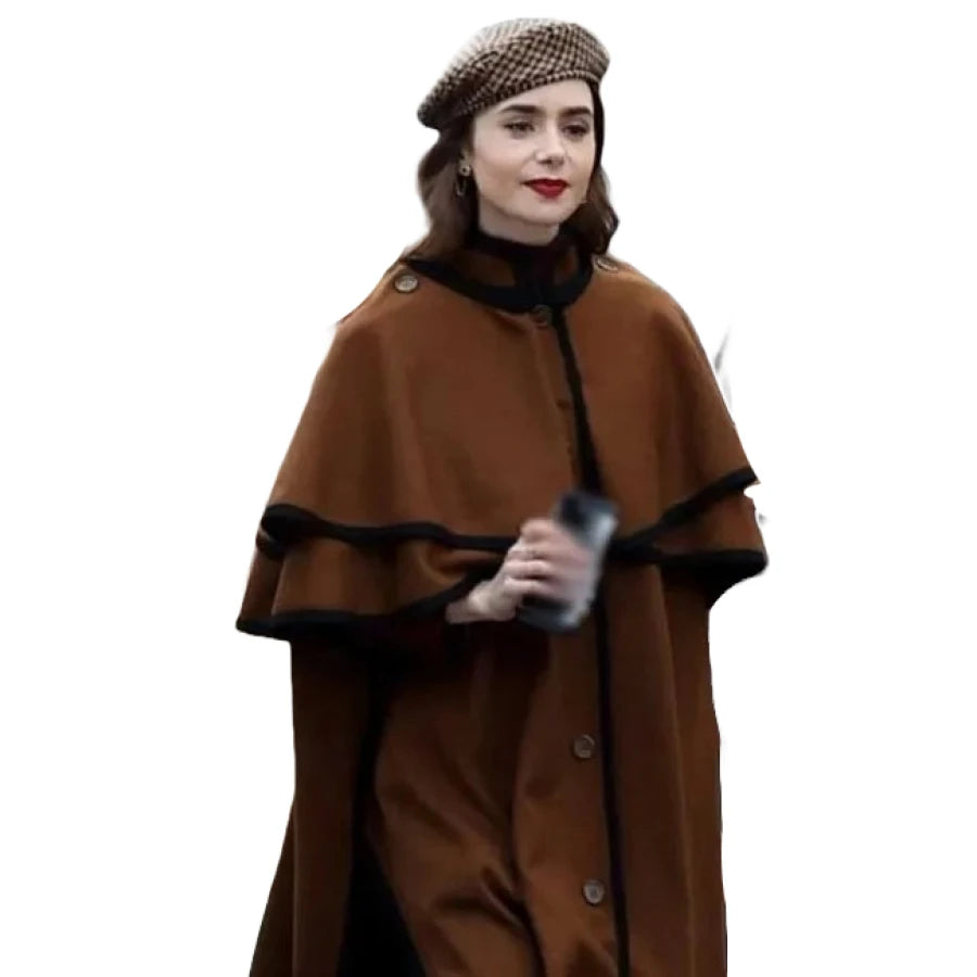 Experience Parisian chic with the Emily in Paris S04 Lily Collins Brown Cape Coat, a timeless and elegant piece inspired by the iconic actress's sophisticated style. Crafted with meticulous attention to detail, this cape coat exudes luxury and grace. Made from high-quality materials, it offers both durability and a luxurious feel. The rich brown hue adds warmth and versatility to any ensemble, while the flowing silhouette and classic design capture the essence of Parisian elegance. The Emily in Paris S04 Lily Collins Brown Cape Coat features a minimalist design with clean lines and subtle detailing, making it a versatile addition to any wardrobe. Whether you're strolling through the streets of Paris or attending a glamorous soirée, this coat effortlessly elevates your look with its understated sophistication. Pair it with a chic dress for a feminine touch or layer it over tailored trousers for a more polished ensemble. Embrace the timeless allure of Lily Collins with this iconic cape coat that epitomizes Parisian charm.Specifications: