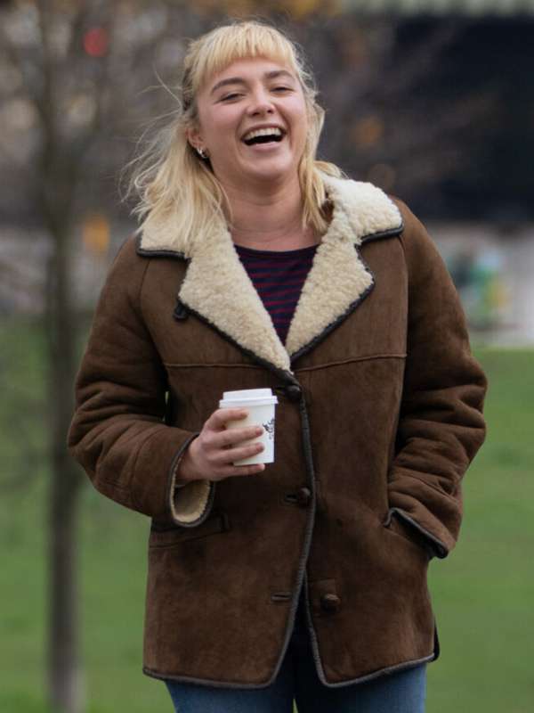 Almut We Live in Time 2025 Florence Pugh Shearling Brown Suede Leather Jacket