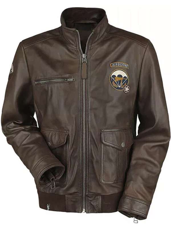 Inspired by the legendary video game Call of Duty: WWII, this brown leather Airborne jacket is a must-have for gaming enthusiasts. Crafted from premium satin fabric with a soft viscose lining, it offers both durability and comfort. Featuring a sleek zipper closure, stand-up collar, and multiple pockets, this jacket perfectly blends military aesthetics with modern style. Whether you're a fan of the game or just love tactical-inspired outerwear, this is a great addition to your wardrobe.