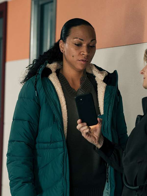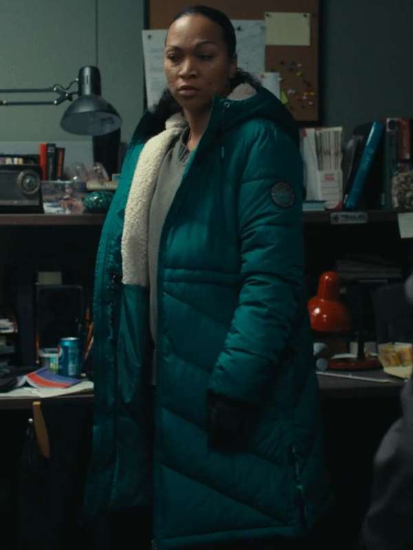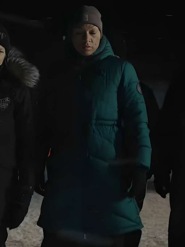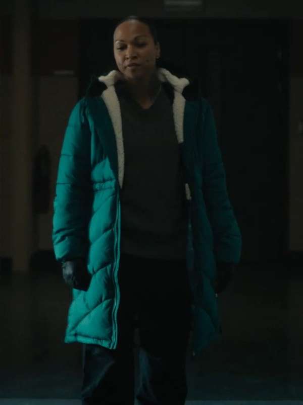 Inspired by Kali Reis as Evangeline Navarro in True Detective Season 4, this green puffer coat combines functionality with style.
