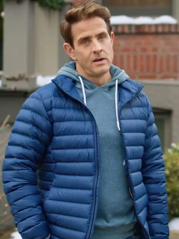 This blue puffer jacket, inspired by Joey McIntyre in *Jingle Bell Love 2024*, offers both style and warmth with its zipper closure, stand-up collar, and full-length sleeves. Perfect for the holiday season.