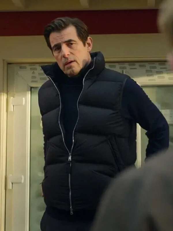Claes Bang's portrayal of John Paul Williams in "Bad Sisters" inspired this sleek black puffer vest. Designed for both style and comfort, it is crafted from parachute fabric with a soft viscose lining. The vest features a zipper closure, a stand-up collar, and multiple pockets, making it a versatile addition to any wardrobe.