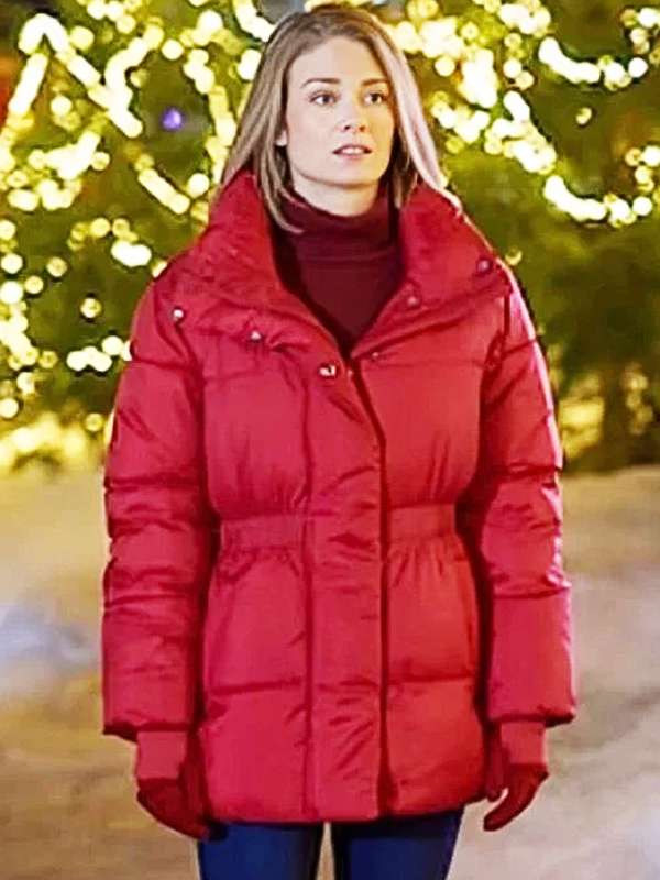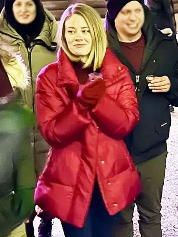 The Anya Red Puffer Jacket, inspired by Kim Matula in *The Finnish Line 2024*, combines warmth with style. Made from durable parachute fabric, it features a stand-up collar, zipper and buttoned closure, and full-length sleeves. With two front pockets and one inside, this jacket is both practical and fashionable for cold-weather wear.