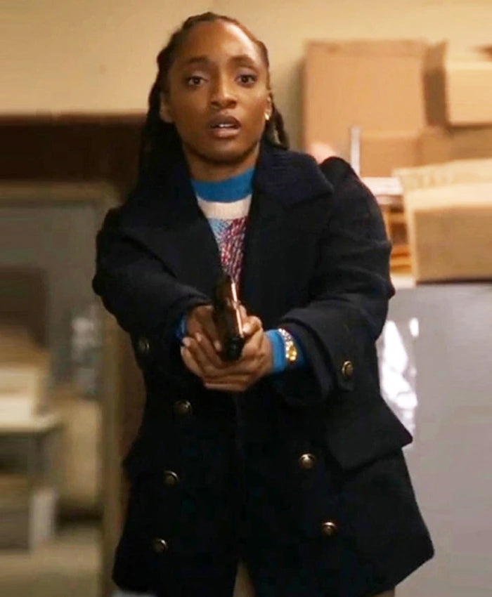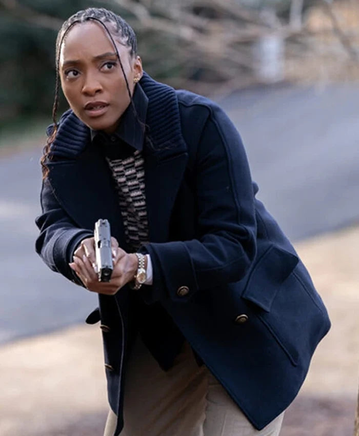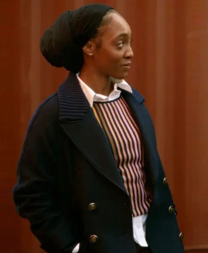 Inspired by Iantha Richardson’s portrayal of Faith Mitchell in Season 3 of Will Trent, this black wool peacoat exudes classic elegance and smart outerwear appeal. Crafted from premium wool fabric and lined with soft viscose, it offers warmth and a tailored fit. The double-breasted buttoned closure, paired with a lapel collar and open hem cuffs, enhances its traditional yet stylish silhouette. Functional details include two side pockets and one inner pocket, making it as practical as it is chic. This peacoat is perfect for layering over both formal and casual outfits during colder months.