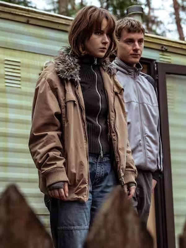 This stylish brown bomber jacket, inspired by Aiko Beemsterboer's character Jezebel van Kamp in Ferry 2, features a shearling fur collar and a cozy viscose lining, offering both warmth and fashion-forward appeal.