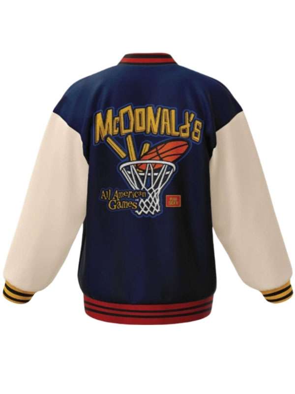 Celebrate iconic sports heritage with the McDonald’s All American Games Varsity Jacket by Playa Society. Crafted from a stylish blend of fleece fabric and real leather, this jacket delivers comfort and classic varsity aesthetics. The ribbed collar and cuffs, buttoned front, and vibrant blue and white contrast give it an authentic athletic edge. A perfect choice for streetwear fans and sports culture enthusiasts alike.