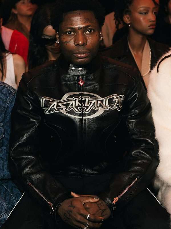 Inspired by Asake, this black leather jacket from Paris Fashion Week features genuine real leather with a smooth viscose lining for comfort. It has a convenient zipper closure and a snap-tab erect collar for a bold statement. The jacket includes two front pockets and two inside pockets for secure storage. Full-length sleeves with zipper cuffs add a modern, edgy touch to this stylish piece.