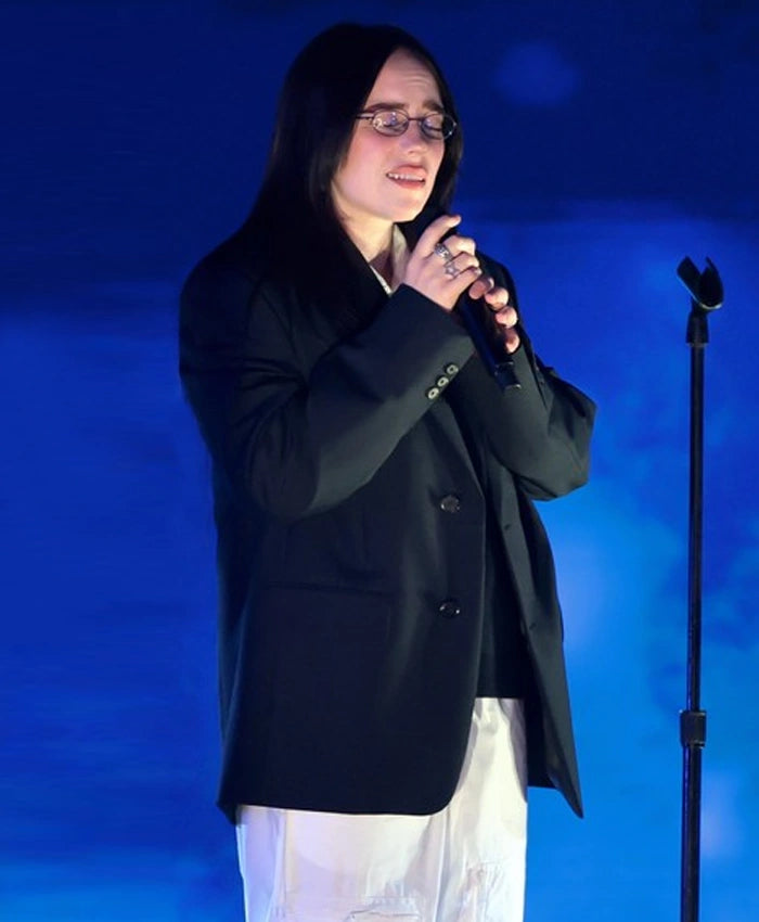 Inspired by Billie Eilish’s fashion-forward appearance at the 2025 iHeartRadio Music Awards, this black blazer offers an effortlessly chic and polished look. Made from high-quality suiting fabric and lined with viscose for comfort, this blazer is designed to provide a sleek and tailored silhouette. The lapel collar and buttoned closure elevate its sophisticated style, while the full-length sleeves with buttoned cuffs ensure a refined finish. Two side pockets and two inner pockets offer practical storage for your essentials. Whether you're dressing up for a special occasion or looking to add some edge to your everyday look, this black blazer is a versatile and fashionable choice.