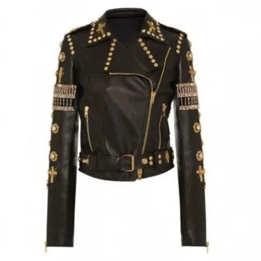 In summary, the Black and Golden Embroidered Leather Jacket is a harmonious blend of bold design and thoughtful features. Elevate your fashion game with this statement piece that effortlessly marries edginess, luxury, and practicality