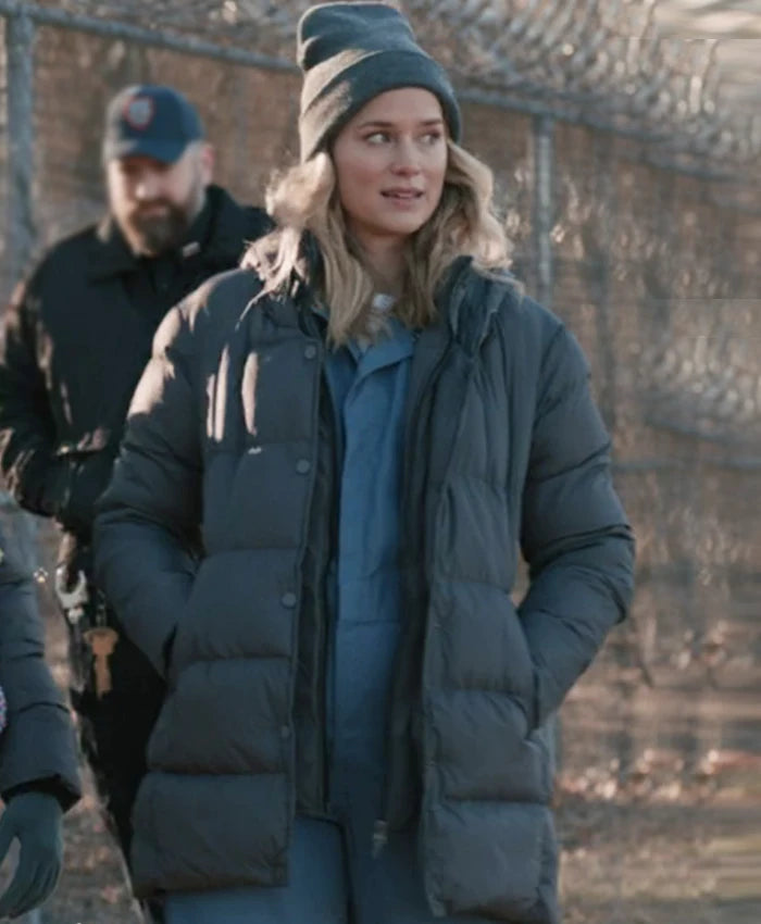 Elizabeth Lail Elsbeth Season 2 Quinn Powers Grey Puffer Coat – A cozy hooded coat with snap-tab and zipper closure, perfect for chilly days in timeless style