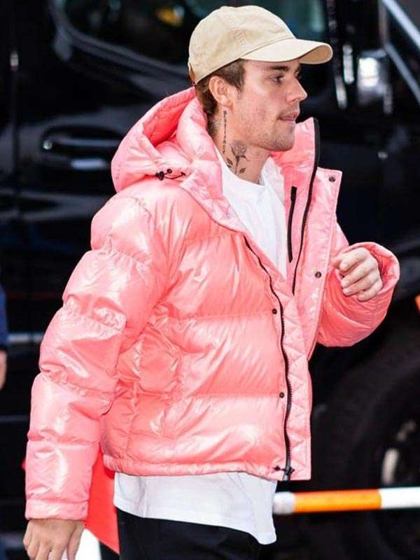 Inspired by Canadian singer Justin Bieber, this pink hooded puffer jacket is made from durable parachute fabric with a soft viscose lining for comfort. It features a zipper and buttoned closure, multiple pockets, and full-length sleeves for warmth and style.