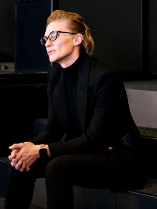 Inspired by Katee Sackhoff’s character Katherine Brunt in *Fight or Flight 2025*, this black blazer combines sharp tailoring and timeless style. Crafted from suiting fabric with a soft viscose lining, it offers a sleek silhouette and a polished look. The double-breasted buttoned closure and lapel collar add to the blazer's elegance, making it perfect for professional and formal occasions.