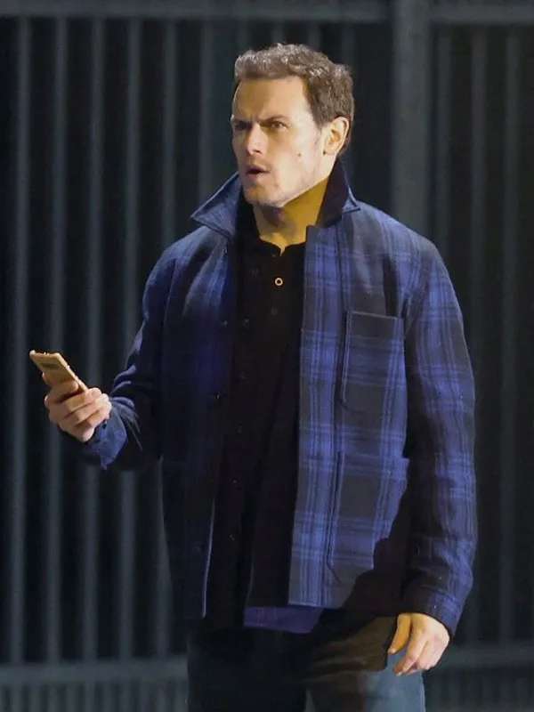 Style yourself like Rob Burns from *Love Again* with this blue wool plaid jacket. It features a buttoned closure, shirt-style collar, and buttoned cuffs.