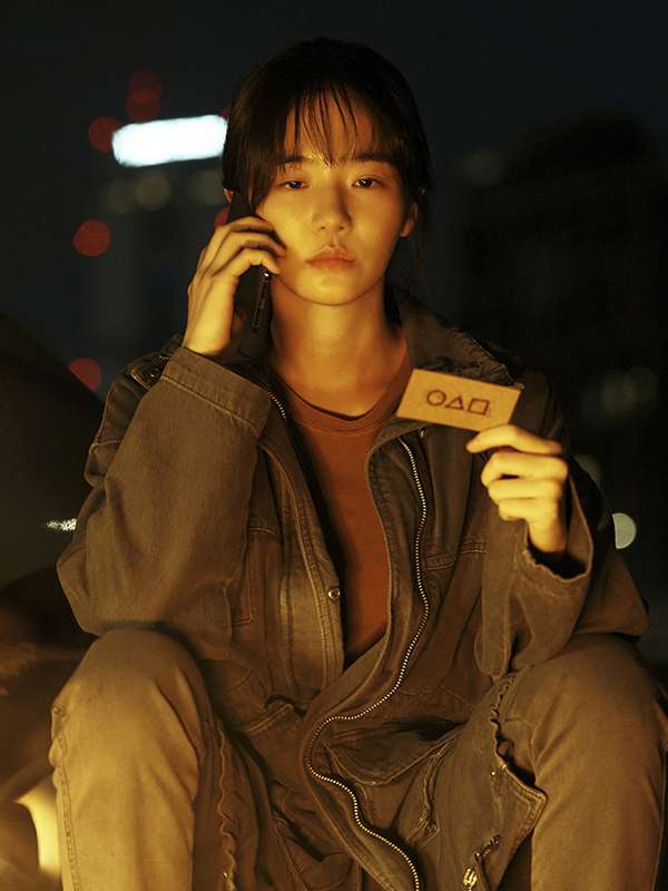 Shop No-eul's stylish grey cotton long jacket from Squid Game S02, inspired by Park Gyuyoung. Featuring a stand-up collar, zipper and buttoned closure, and full-length sleeves for a comfortable fit.