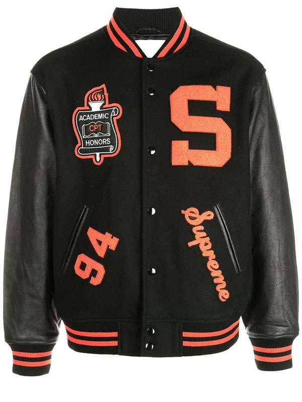 The Academic CPT Honors 2019 Supreme Team Varsity Jacket combines wool fabric and real leather for a classic and durable design. It features a ribbed collar, buttoned front closure, and full-length sleeves with ribbed cuffs. With two front pockets and two inside, this black varsity jacket is both stylish and functional.