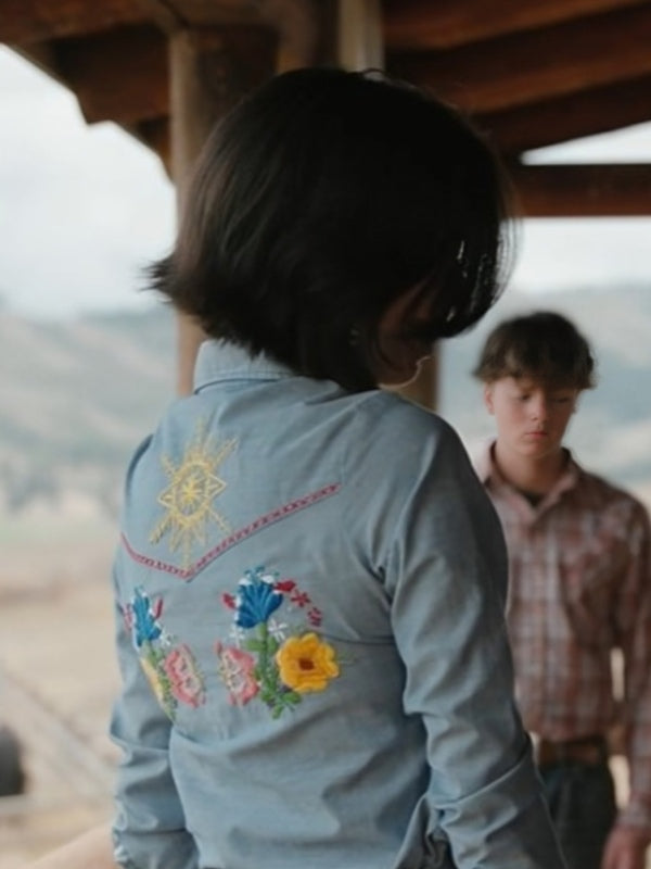 Shop the Yellowstone Season 5 Monica Dutton floral chambray shirt worn by Kelsey Asbille. Made from denim fabric, this shirt features a button closure, shirt-style collar, long sleeves, and two front chest pockets. The blue color adds a versatile touch to any wardrobe.