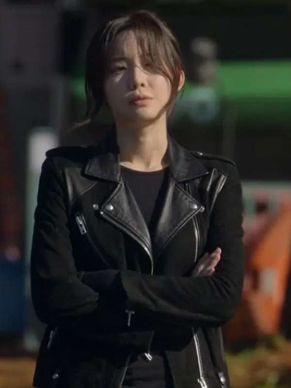 Channel Choi Yoon-ji's bold and edgy style with this black biker jacket inspired by *The Trunk S01*. Crafted with a blend of real leather and fabric, this jacket combines durability with a sleek design. The lapel collar and zipper closure enhance its classic biker vibe, making it a standout piece for any wardrobe.